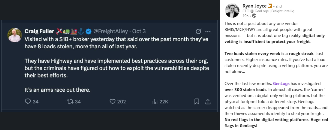 Ryan Joyce, CEO of GenLogs, who argues that digital-only carrier vetting isnāt enough to safeguard freight. Joyce revealed that GenLogs has analyzed more than 300 stolen loads, many linked to carriers that passed standard digital verification but vanished from the road before thieves assumed their identities. His post shines a light on a growing flaw in current vetting systems, and previews GenLogsā upcoming lane-level compliance filters, designed to verify a carrierās physical presence and equipment before tendering.