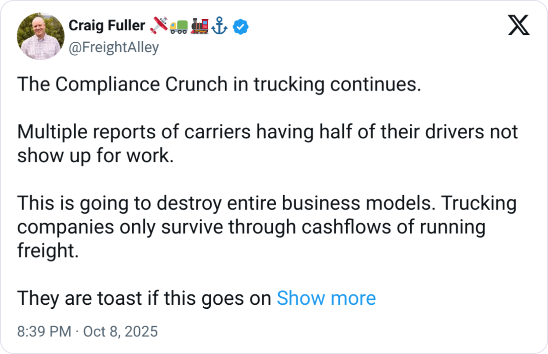 With FMCSA and ICE tightening enforcement, drivers are being sidelined, and carriers built on this model face potential bankruptcy. Industry voices like FreightWavesā Craig Fuller warn that a market correction is coming, one that could finally rebalance rates but at the cost of widespread disruption across fleets, brokers, and supply chains.