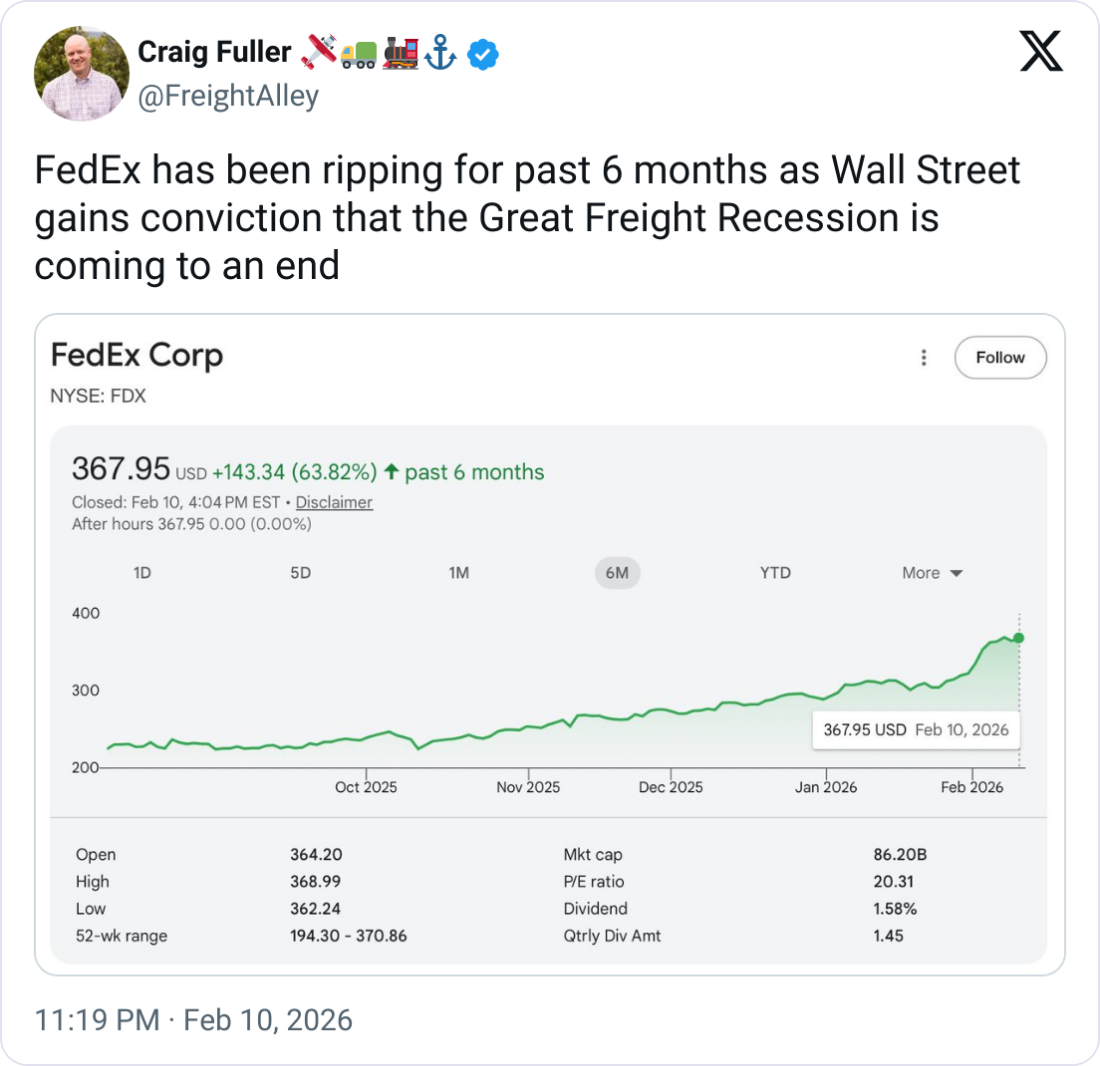 💰 Freight Stocks Are Waking Up. According to Craig Fuller, Wall Street is starting to believe the Great Freight Recession may finally be ending. FedEx is up sharply over the past six months and just doubled down on that optimism by teaming up with Advent to acquire Polish parcel-locker giant InPost in a $9.2B deal, giving it direct access to one of Europe’s largest out-of-home delivery networks. The move gives FedEx direct access to one of Europe’s largest out-of-home delivery networks.