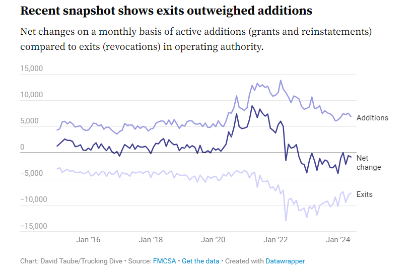 📊 Trucking's Gradual Capacity Crunch. The trucking industry's capacity attrition slowed in Q2 2024, but challenges drag on. Federal data shows about 9,000 businesses exited in April, with slower rates in May and June. Despite this, exits still outpaced new entries. Industry expert Avery Vise notes the decline is "still highly negative in historical terms." With over 93,000 more carriers than in February 2020, the market remains saturated. Favorable conditions aren't expected until 2025 at the earliest.