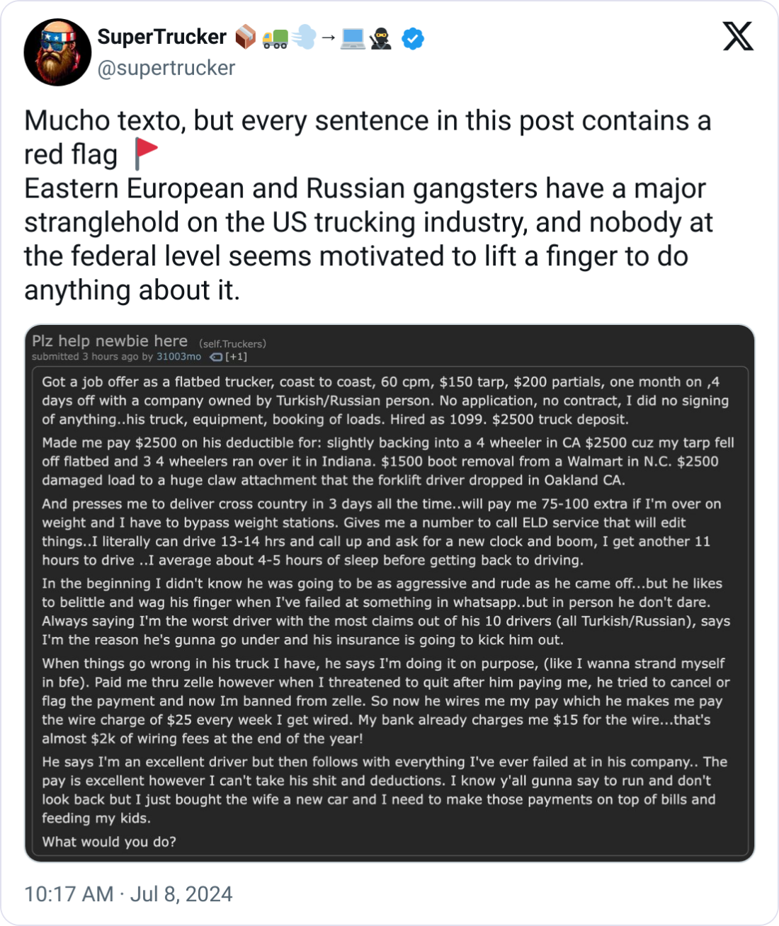 Veteran Trucker Raises Alarm. @SuperTrucker pointed to a concerning trend of fraudsters with "Eastern European and Russian gangster" ties.