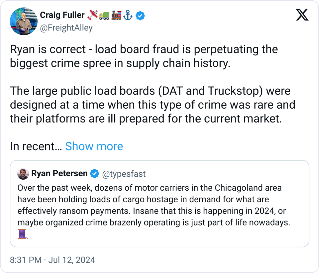 Craig Fuller, CEO of FreightWaves, Adds Perspective. Fuller echoed Petersen's concerns, describing the situation as "the biggest crime spree in supply chain history." He says that outdated load board platforms, the rise of offshoring, and higher value targets have compounded the issue.