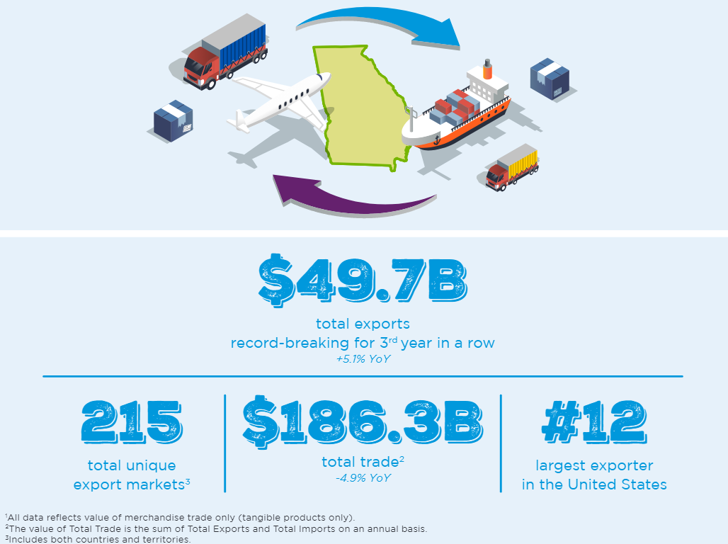 ๐ Georgia's Export Milestone. Despite a decline in total trade, Georgia's exports hit a record high for the third consecutive year, reaching $49.7 billion. There was a marked decrease in imports from China, though the country remains the state's number one trading partner.