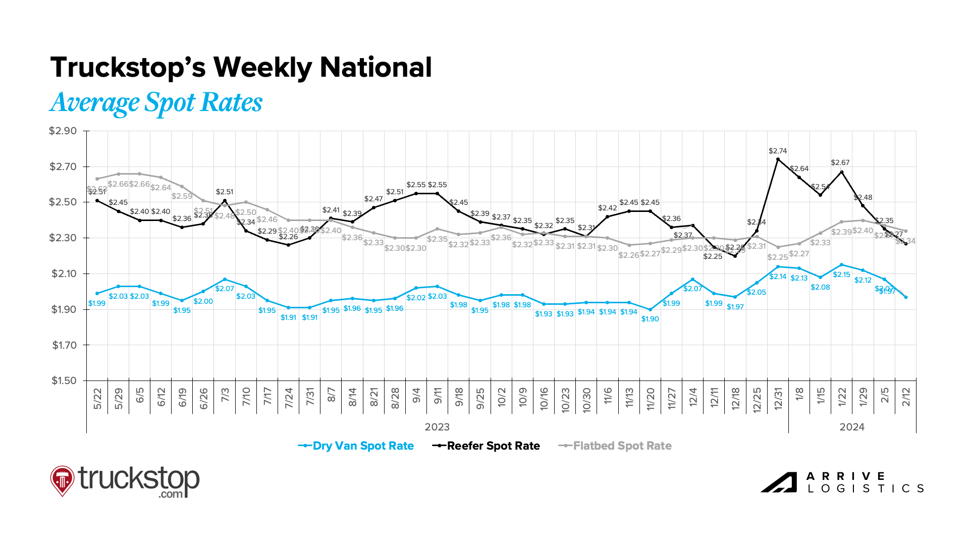 January experienced a spike in spot demand due to winter storms, with spot load postings up nearly 50% from December, though still down 36.7% year-over-year. What did February bring? Scroll to our main story to find out.