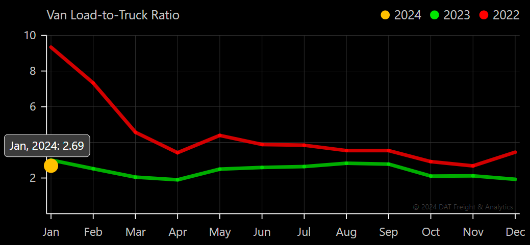 January experienced a spike in spot demand due to winter storms, with spot load postings up nearly 50% from December, though still down 36.7% year-over-year.