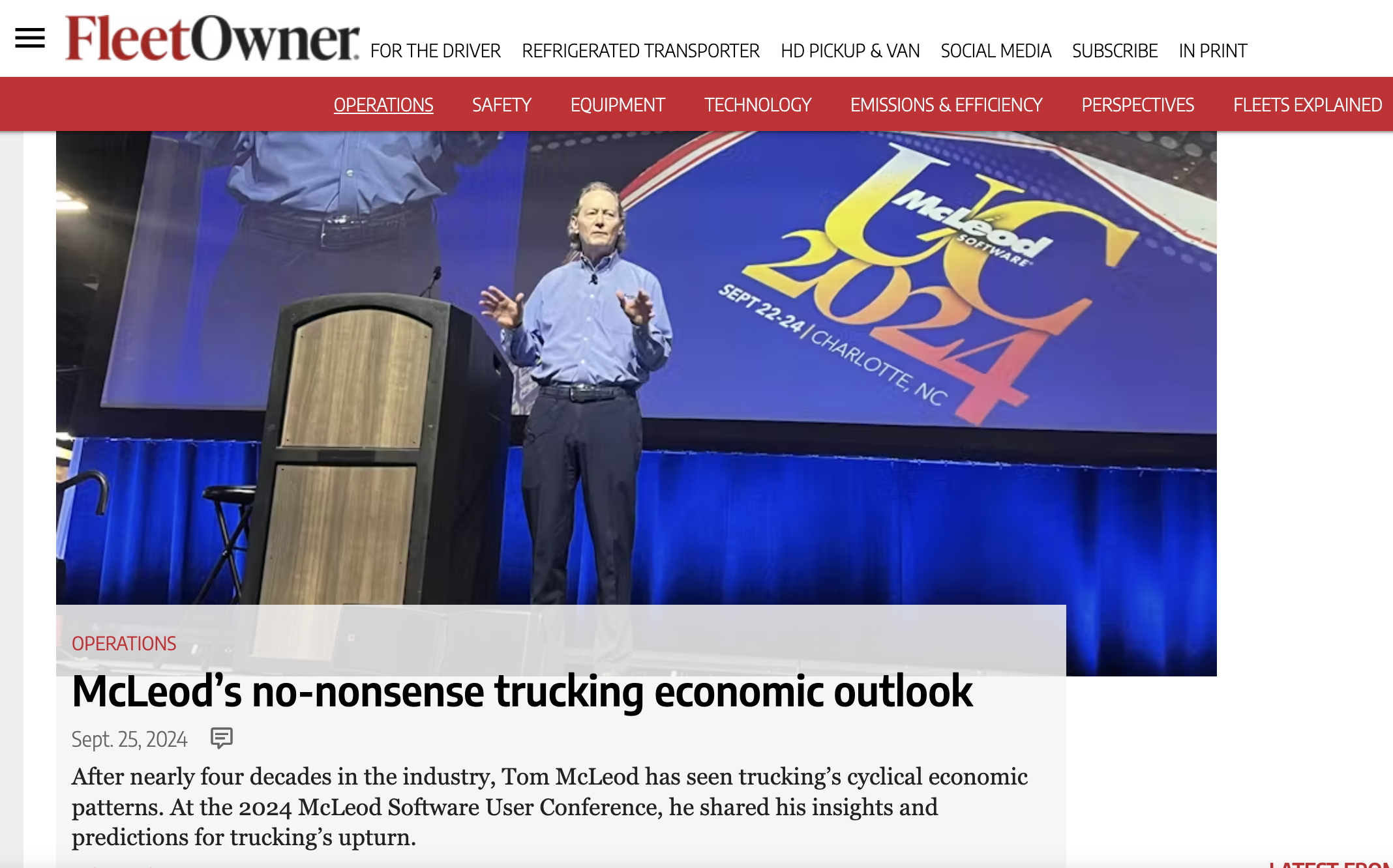 📊 McLeod's Seasoned Freight Forecast. Software CEO Tom McLeod offers pragmatic economic outlook based on four decades of freight cycle observations, providing industry-wide insights.