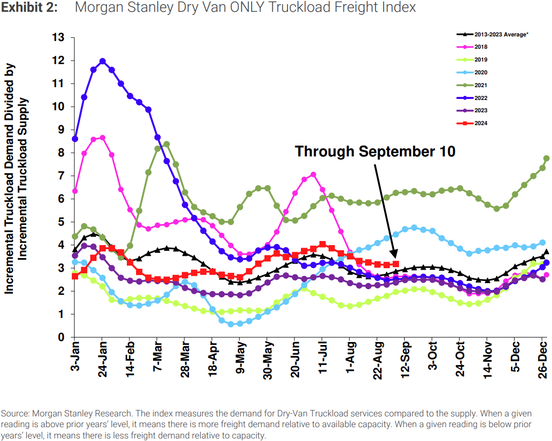 At the moment, demand is stable, capacity is abundant, and rates are likely to mirror what we saw in 2023. Even though the potential port strike and Hurricane Helene could cause some regional bumps, significant changes in the overall market aren't likely in the coming months.