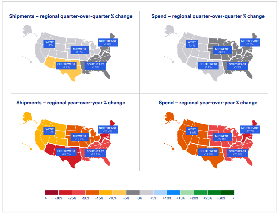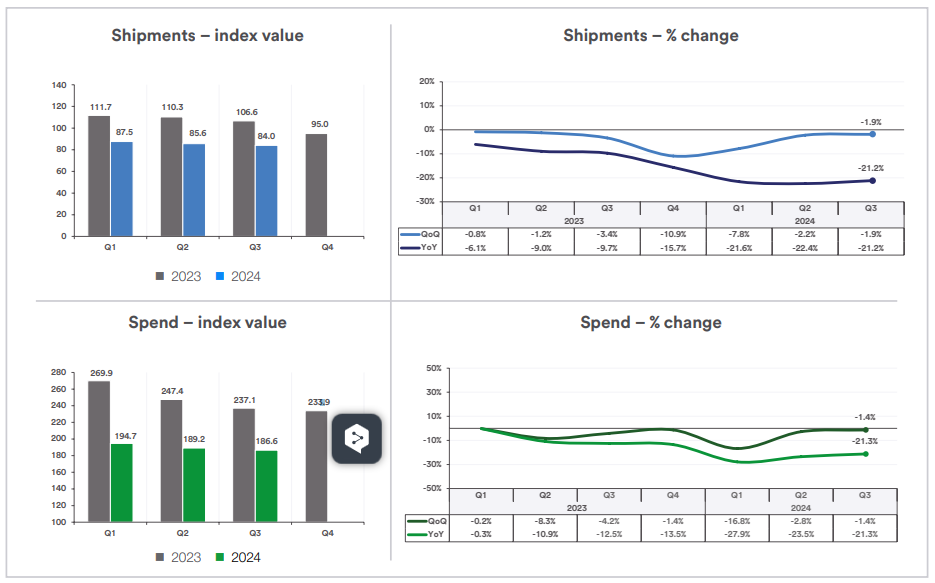 The Q3 2024 U.S. freight payment index shows a slowdown across the freight market, with both the shipment and spending index values dipping. But there’s a silver lining: the rate of decline is slowing, hinting at the possibility of hitting the bottom.