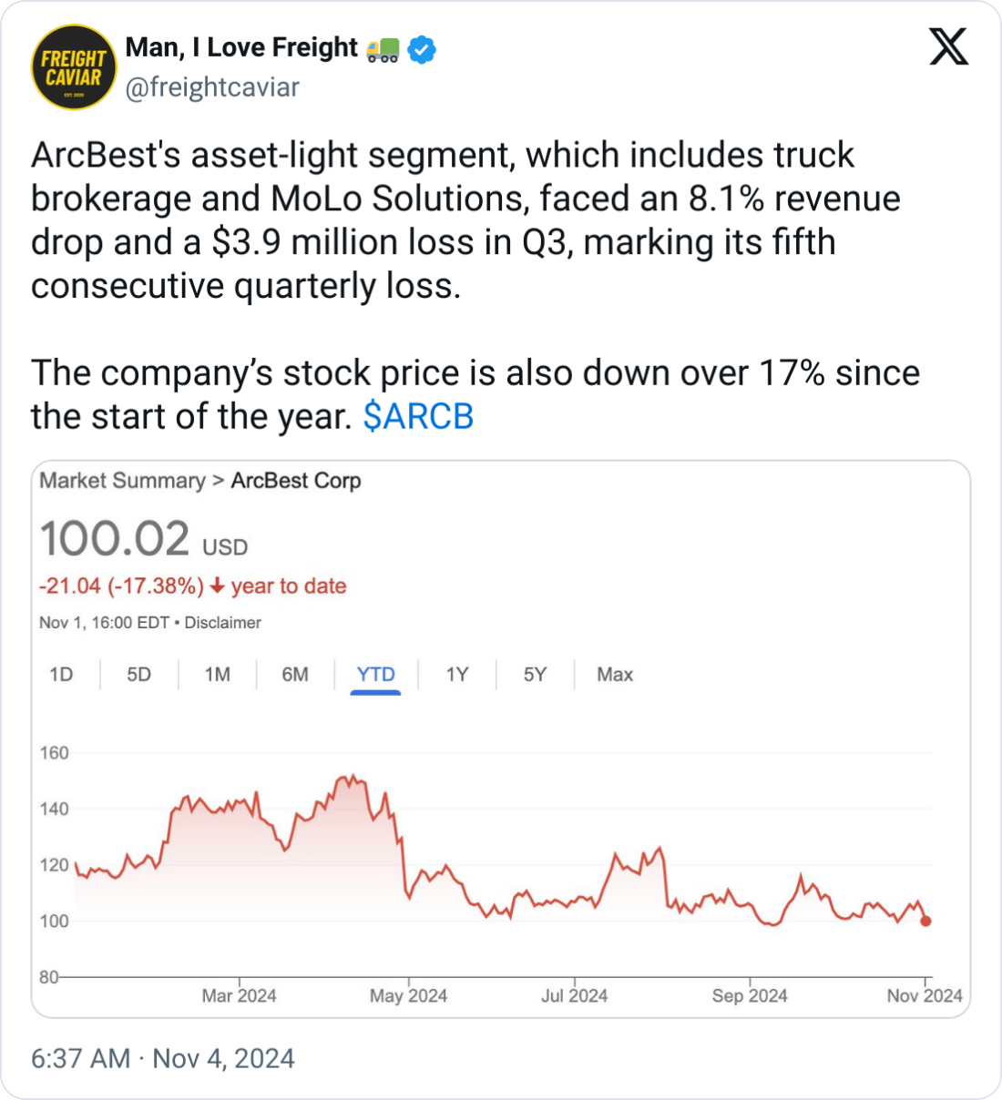 📉 ArcBest Sees Challenges & Growth. ArcBest’s asset-light segment, including truck brokerage & MoLo Solutions, reported a $3.9 million operating loss in Q3, its fifth consecutive quarterly loss, as revenue declined 8.1% year-over-year to $385.3 million due to weak demand and lower shipment sizes. Despite this, the company achieved a 187% rise in net income to $100.3 million ($4.23 per share), driven by rigorous cost controls, productivity improvements, and a $69.1 million adjustment from a previous acquisition’s earnout provision. While both the asset-based and asset-light segments faced headwinds, ArcBest remains focused on managed transportation growth and strong customer retention to support long-term strategic goals, according to CEO Judy McReynolds.