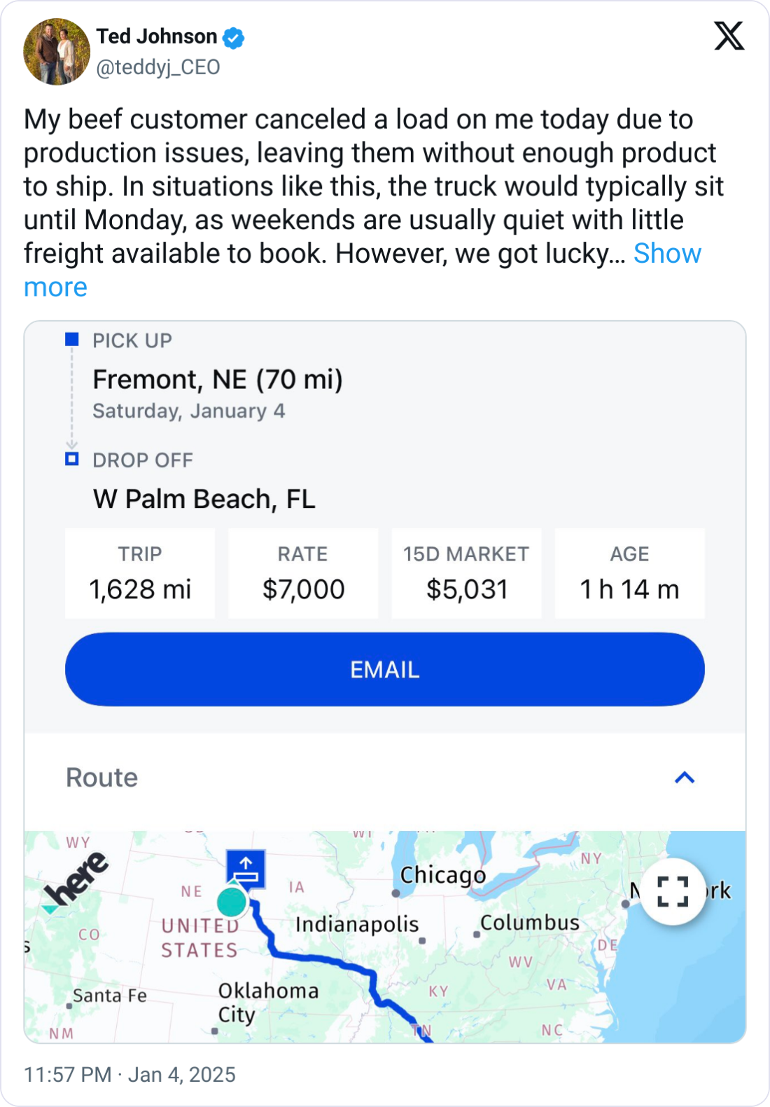🥩 Beefed Up. Ted Johnson, CEO of Elite Commodity Express, shared that despite a weekend beef load cancellation, he quickly secured another great paying load. Could this signal signs of the freight recession ending?