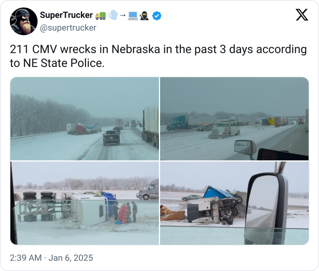 ❄ Winter Storm Severely Impacting Freight Lanes. The major winter storm from Saturday to Monday is disrupting trucking operations along key freight corridors in the Midwest and Mid-Atlantic. WeatherOptics highlights extreme risks on I-65 (Indianapolis ⇄ Nashville), I-35 to I-80 (Kansas City ⇄ Chicago), and I-44 (Oklahoma City ⇄ St. Louis), with road closures, delays exceeding 50%, and treacherous conditions caused by heavy snow and freezing rain. I-75 and I-70 will also face significant delays and dangerous travel. Drivers should anticipate widespread hazards, including impassable roads and heightened accident risks. Freight companies must plan for alternative routes, extended transit times, and remind drivers to exercise caution because the slippery roads have caused numerous trucking accidents over the weekend.