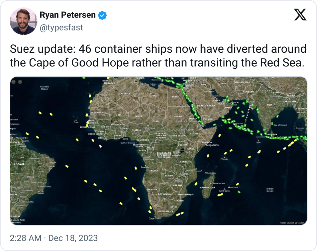 Greg Miller, Senior Editor at FreightWaves: Miller points out the paradoxical market response to the attacks in the Red Sea. He notes, "The view in the stock market is that disruptions in the Red Sea will cause more ships to reroute around the Cape of Good Hope, with longer average voyage distance helping to offset oversupply, supporting rates higher than they’d be minus the Red Sea attacks."