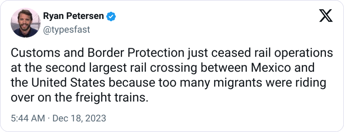 🛤️ CPB Ceases Rail Operations. CBP to suspend railway operations in Eagle Pass and El Paso for migrant custody support starting December 18. The suspension is temporary, but no date for resuming operations was given in the initial report.