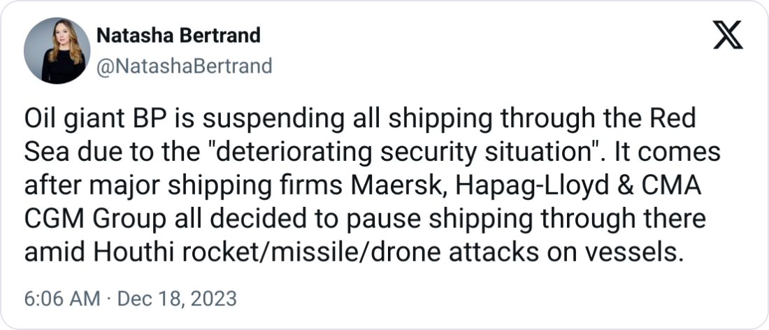 Looking Forward: The U.S. is set to announce Operation Prosperity Guardian, an expanded maritime protection force for the region. It is believed to have secured the involvement of Jordan, the UAE, Saudia Arabia, Qatar, Egypt, and Bahrain. They are hopeful that China will lend its support as well, given its economic stake.