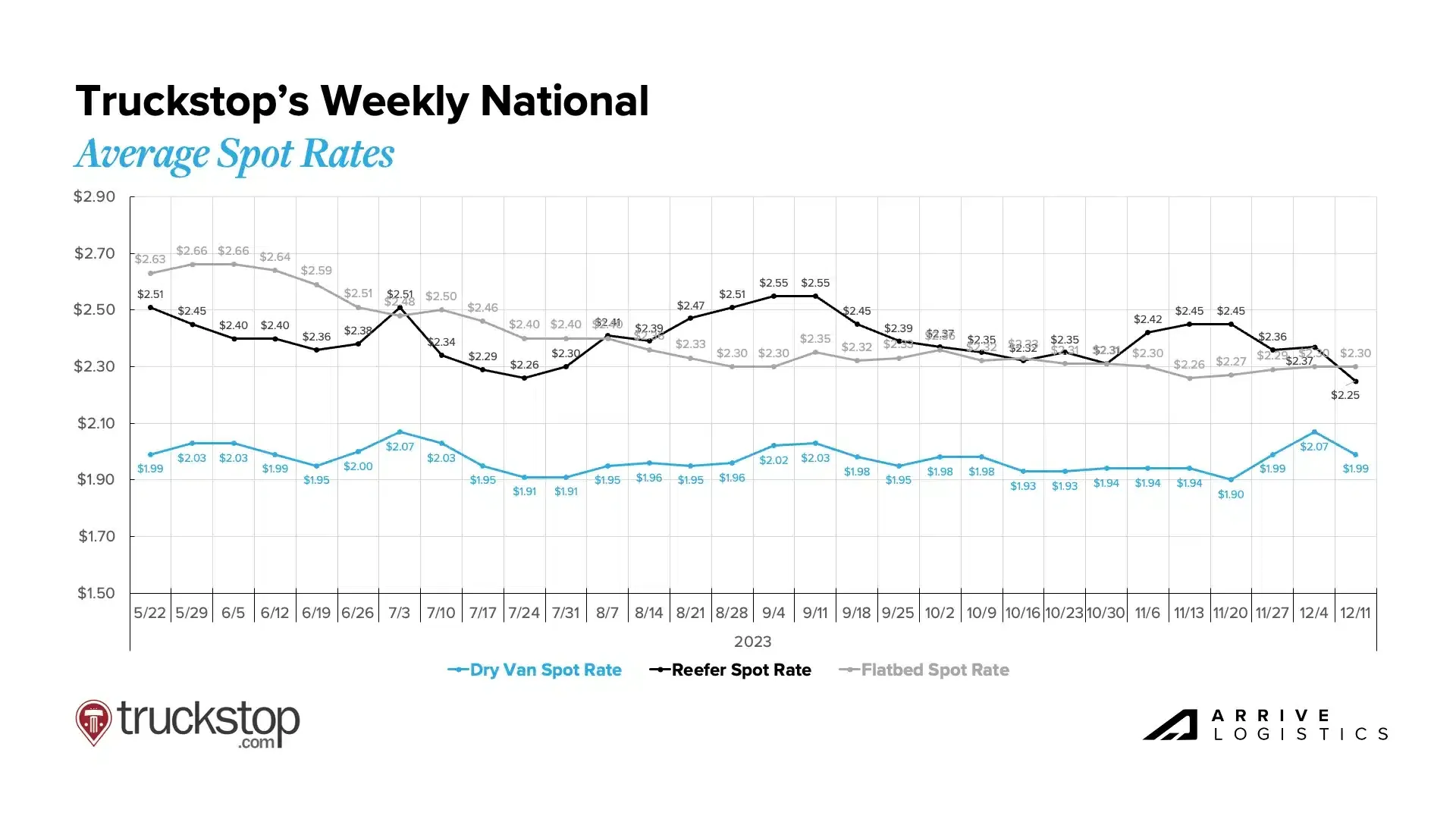 📊 Arrive's December 2023 Market Update. November's freight market showcased varied trends: Van rates spiked post-Thanksgiving, while reefer rates climbed in early November but later fell. Flatbed rates remained steady with minor changes. Truckload capacity was adequate for the holiday season, though some regional tightness was anticipated. Van tender rejections stayed below 4%, reflecting strong compliance with contracts. Despite slight inflation, consumer spending remained high, influencing the Federal Reserve to keep interest rates steady. The freight market is moving towards equilibrium in 2024, with potential rate convergences and increased spot rates.