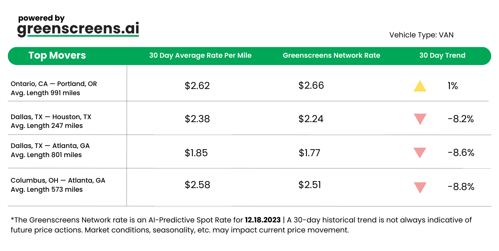 *Greenscreens.ai, forecasts real-time truckload buy prices that are suited to each freight brokerage's purchasing power using AI and machine learning. Its engine takes into account over 130 attributes and data points in each rate forecast.