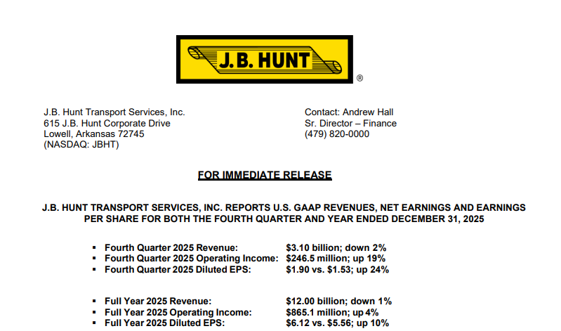 📈 J.B. Hunt Posts Strong Q4 Finish. J.B. Hunt Transport Services reported Q4 operating income of nearly $247 million, up 19% year over year, driven by cost cuts, lower personnel expenses, and productivity gains. Revenue growth came from truckload and dedicated contract services, though full-year revenue fell 1% to $12 billion. CEO Shelley Simpson said the freight market “feels fragile” entering 2026. Dedicated services added 40 new customers, helping J.B. Hunt gain market share despite uneven demand.