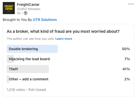 In the FreightCaviar LinkedIn poll sponsored by OTR Solutions, brokers voiced their top fraud concerns, revealing 'Double Brokering' as the leading issue with 50% of votes.