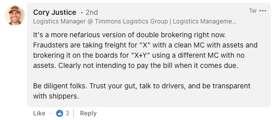 From the comments, various insights were shared, including Graeme Alderman noting the misuse of good MCs for fraudulent activities, and Cory Justice highlighting a sophisticated form of double brokering involving clean MCs and the intention of not paying the bill. Dewayne Smith and lucio Gilbert shared experiences with suspicious brokers and attempts at smuggling across borders, reflecting the multifaceted nature of fraud concerns in the brokerage industry.