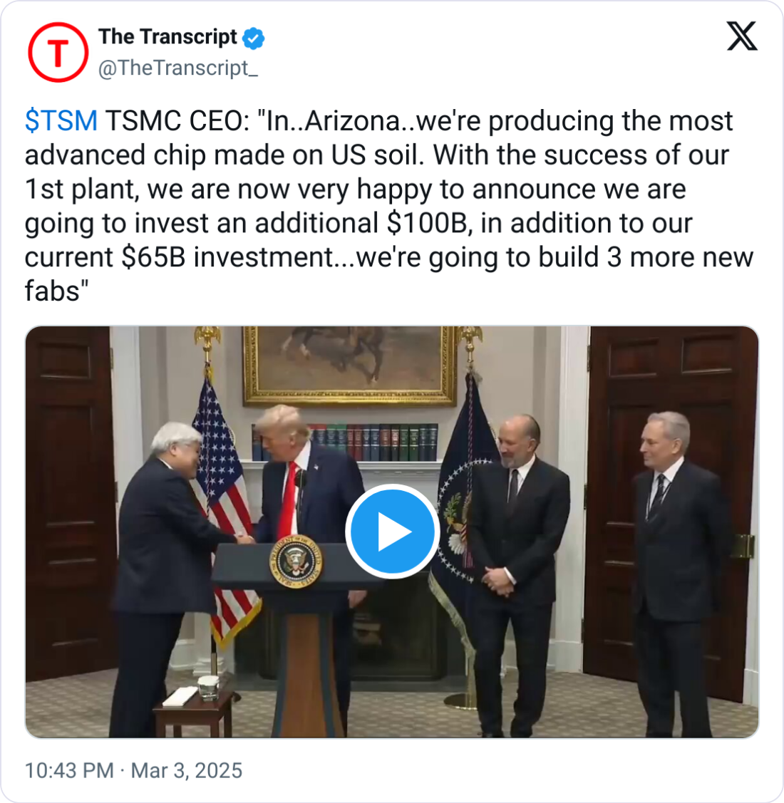 Taiwanese chip giant TSMC announced plans to invest an additional $100 billion into U.S. semiconductor manufacturing, building upon $65 billion previously committed, including facilities already underway in Arizona.