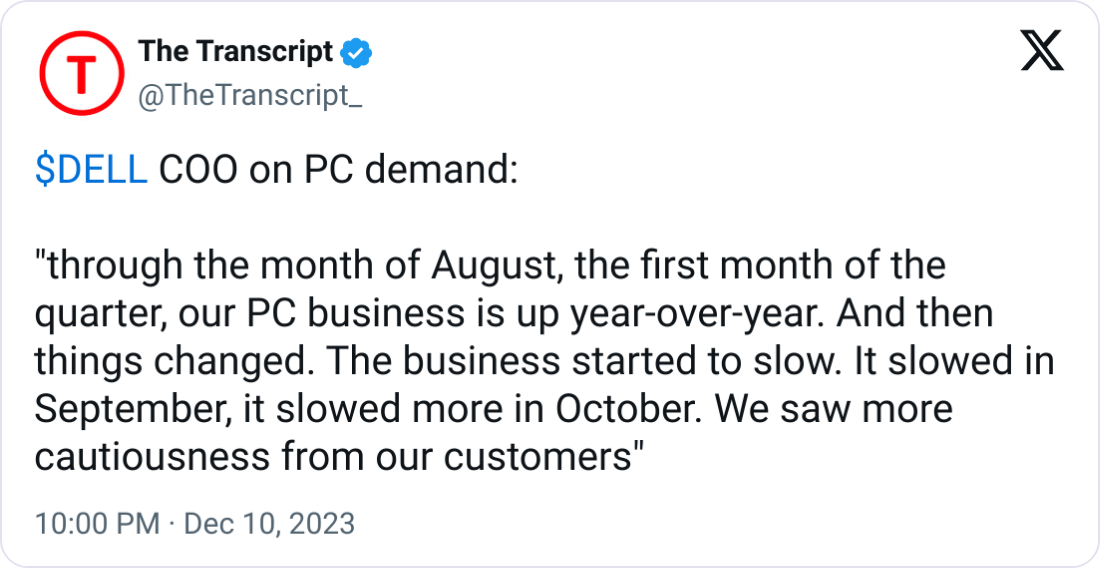 📉 PC Demand Slump: Dell’s COO reported a year-over-year increase in PC business until a notable slowdown began in September, with growing customer cautiousness.