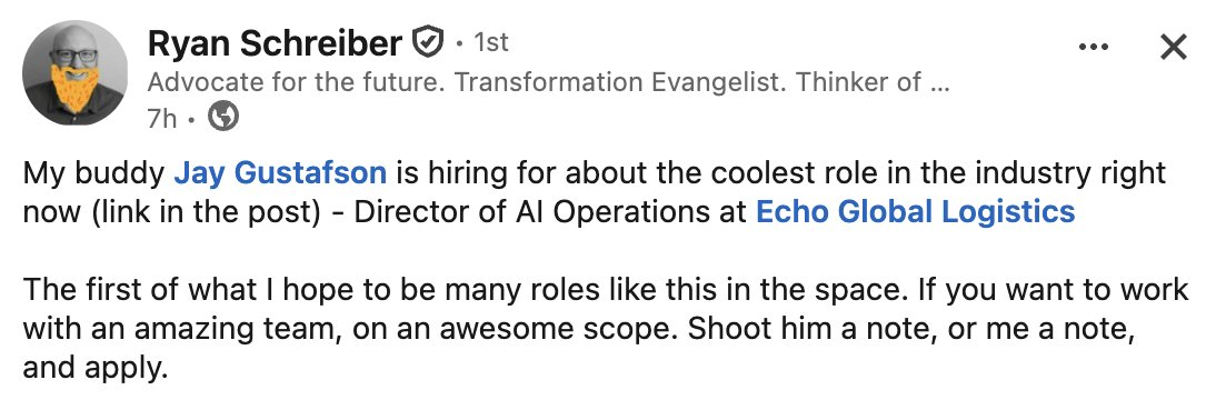 💼 Echo Logistics' AI Hire. A brokerage posting a dedicated AI ops role says more about where this industry is going than any white paper.