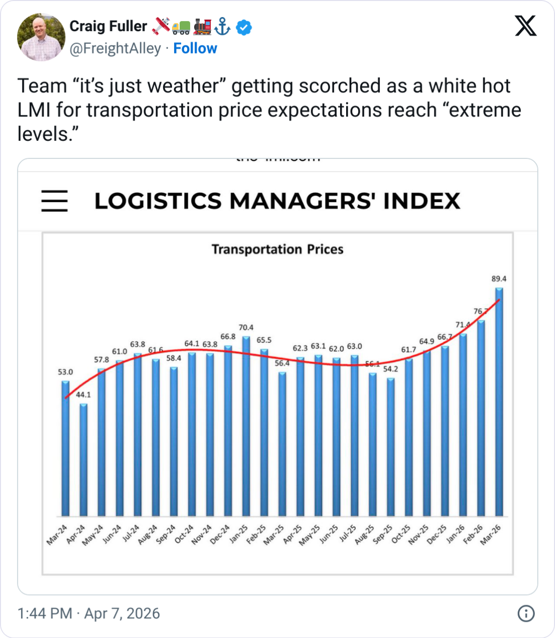 Good Monday morning. The March Logistics Managers' Index just dropped, and it's giving 2022 vibes as transportation prices hit their highest reading in four years.