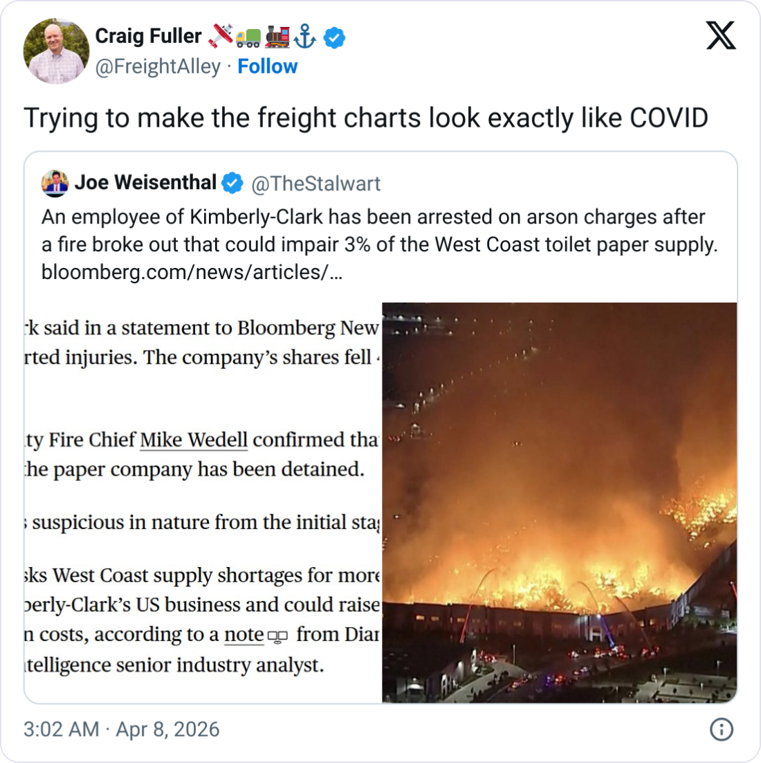 The March LMI reads like 2022 with prices at a 4-year high. Plus: warehouse arson in California, Mexico's trucker strike enters day three, and broker margins are still underwater.