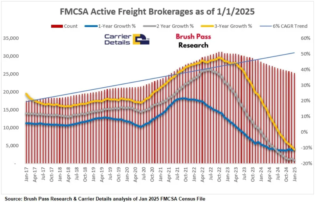 According to Brush Pass Research, 3,104 freight brokerages deactivated in 2024, with thousands more failing in 2023.