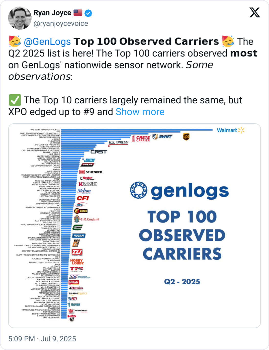 đ„ Top 100 Most Observed Carriers. GenLogs has published its list of the Top 100 Most Observed Carriers. Walmart is at the top of the list, with UPS coming in at the number 2 spot.