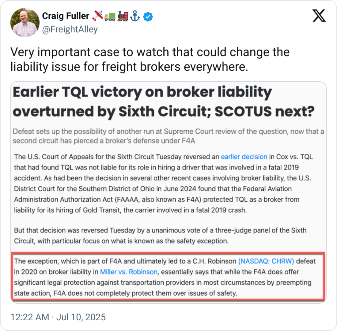 âïž Broker Liability Debate Escalates as Sixth Circuit Reverses TQL Victory. The Sixth Circuit has reignited the debate over freight broker liability, ruling in Cox v. TQL that the Federal Aviation Administration Authorization Act (F4A) does not shield brokers from state-law claims related to motor vehicle safety. The court reversed a prior decision in favor of Total Quality Logistics, finding the F4Aâs safety exception applies even if the broker doesnât operate vehicles. This adds to a growing circuit split, pitting the 6th and 9th Circuits against the 7th and 11th, and may increase pressure on the Supreme Court to settle the issue. Brokers now face heightened legal risk in several key states such as Ohio, Kentucky, Michigan, and Tennessee.