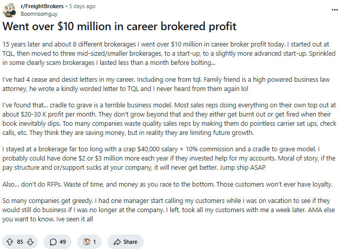 Over on r/FreightBrokers, Reddit user Boomroomguy shared how he made over $10 million as a broker and offered some advice for up-and-coming brokers. One piece stood out: