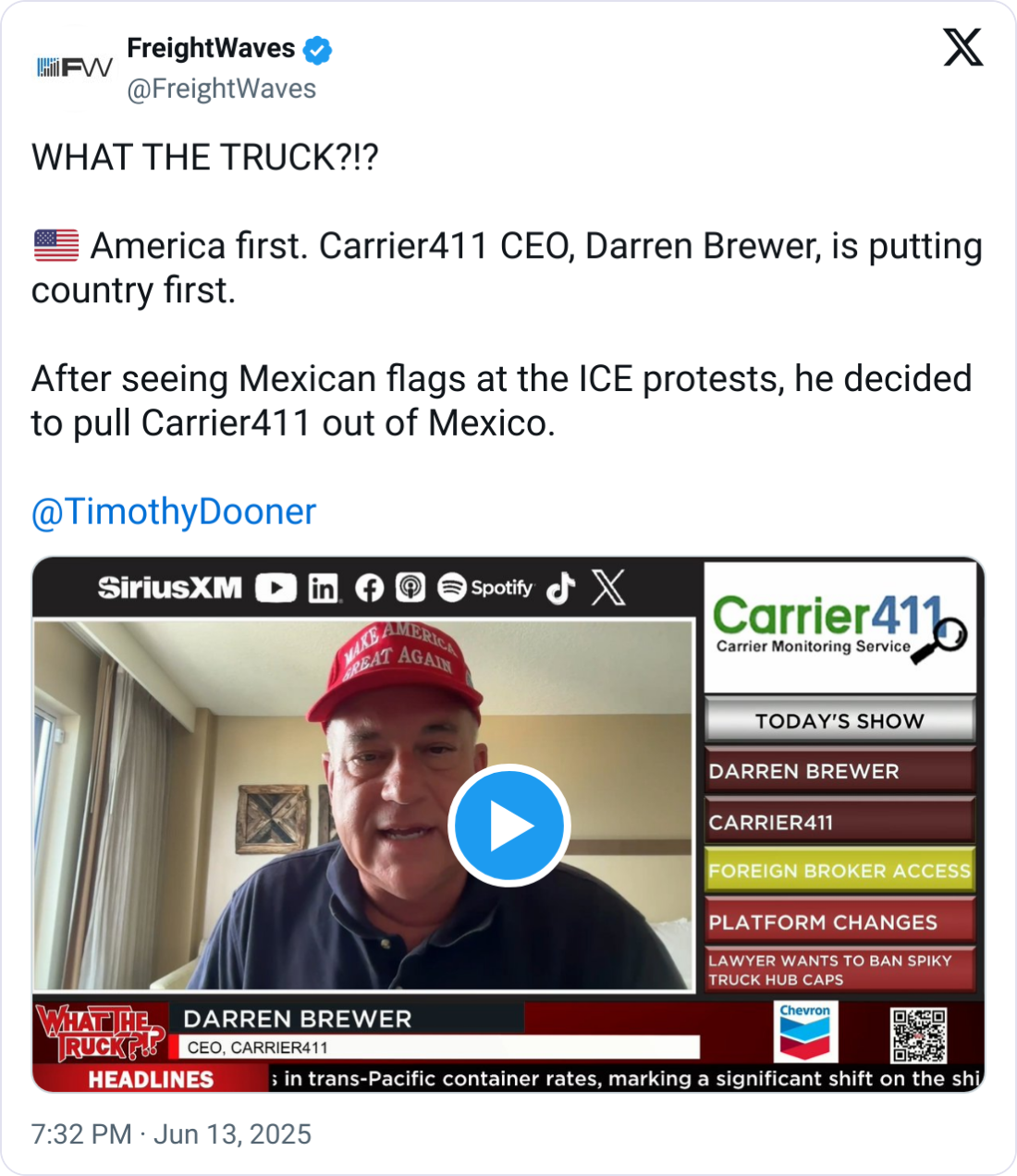 “I see all these people standing above cars, waving Mexican flags, and the devastation, the destruction of Los Angeles. I said, ‘something’s not right,’” Brewer said during a June 14 appearance on FreightWaves' What the Truck?!?