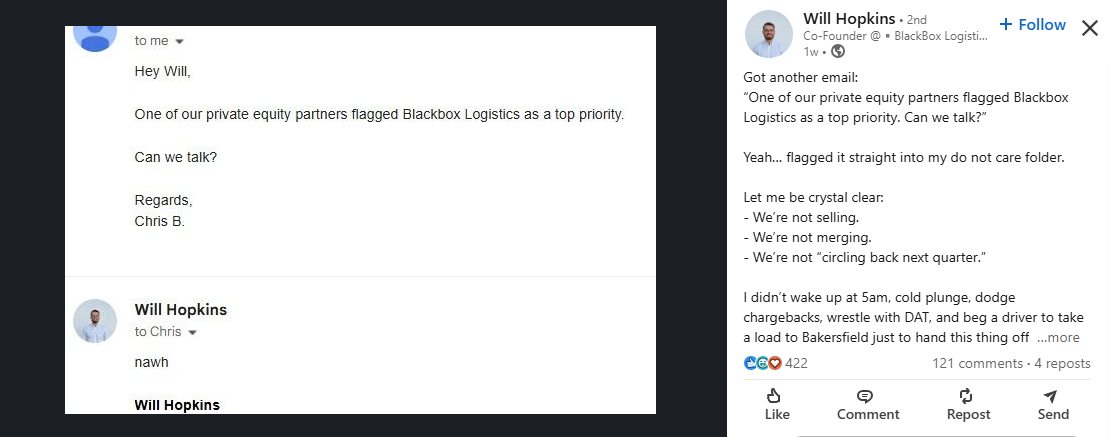 Will Hopkins, Co-Founder at BlackBox Logistics, is making one thing clear—BlackBox Logistics isn’t for sale.