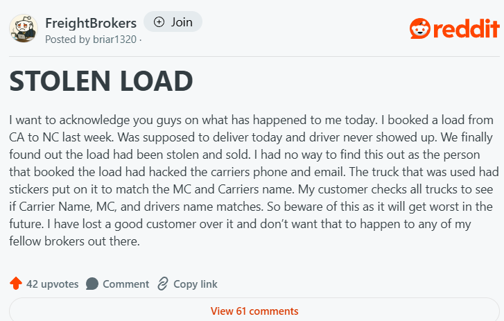 Over on r/FreightBrokers, yet another cargo theft case. Reddit User briar1320 shared how a load from California to North Carolina disappeared after the carrier failed to deliver.