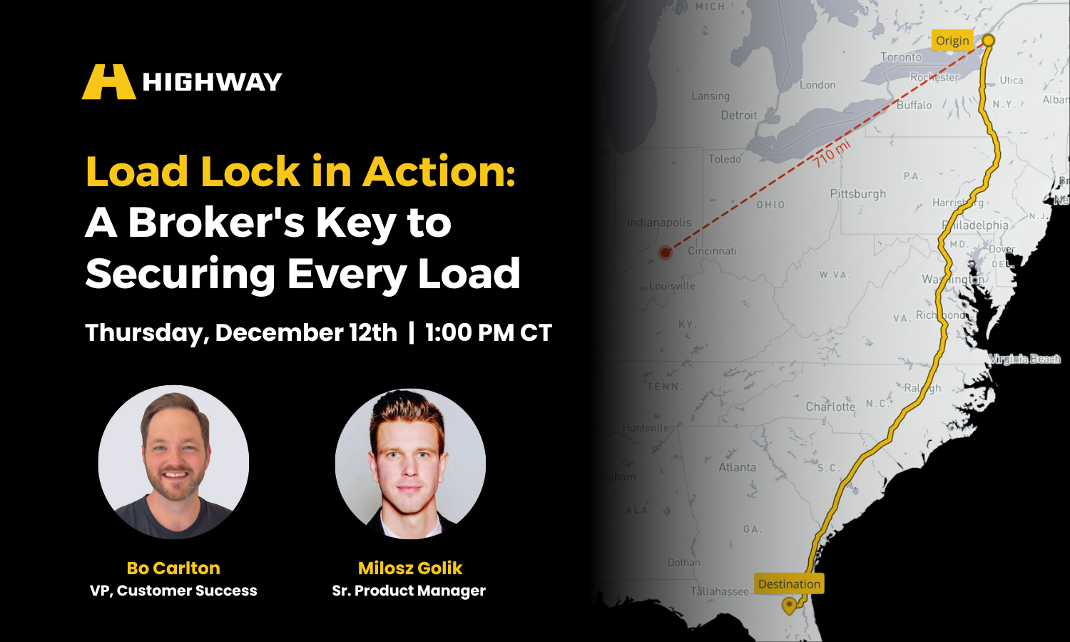 Join Highway's Bo Carlton, VP of Customer Success, and Milosz Golik, Senior Product Manager, for an exclusive demo of their newest tool – Load Lock. Learn how load-level monitoring keeps every load secure, start to finish.