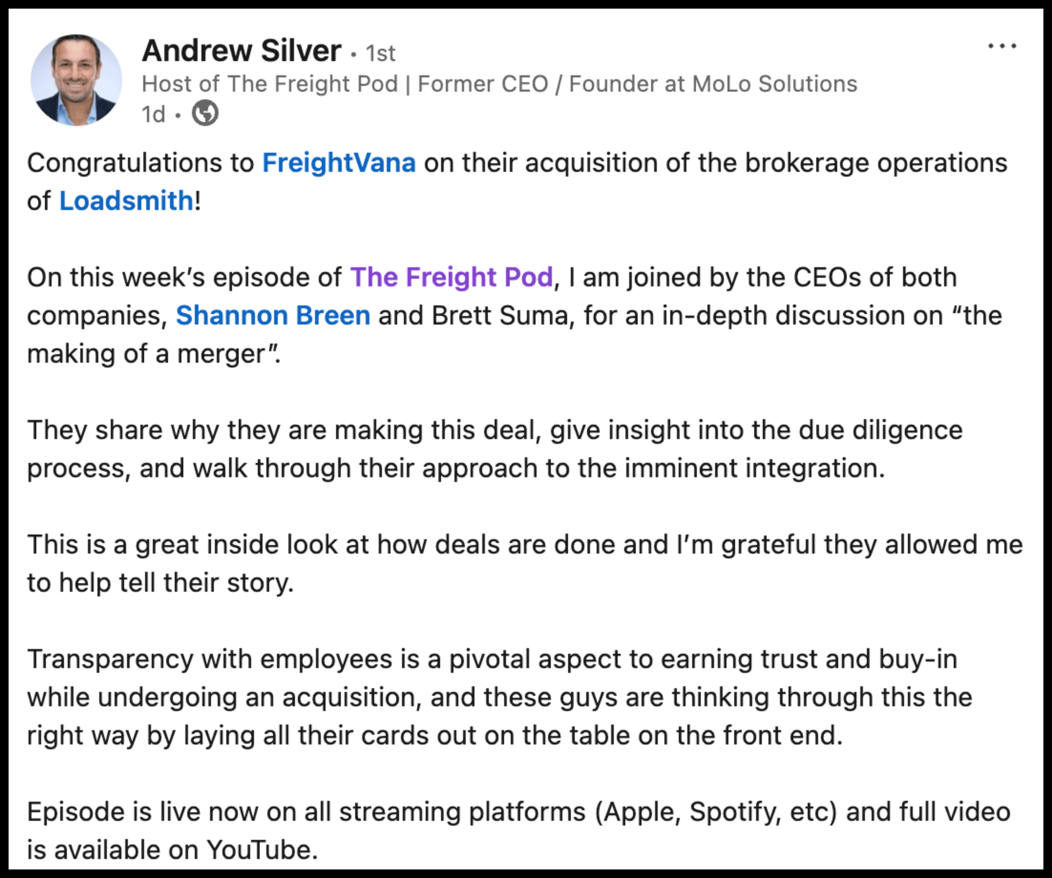 Breen and Suma joined Andrew Silver on his The Freight Pod podcast to discuss the deal's details and what it means for the power-only logistics market.