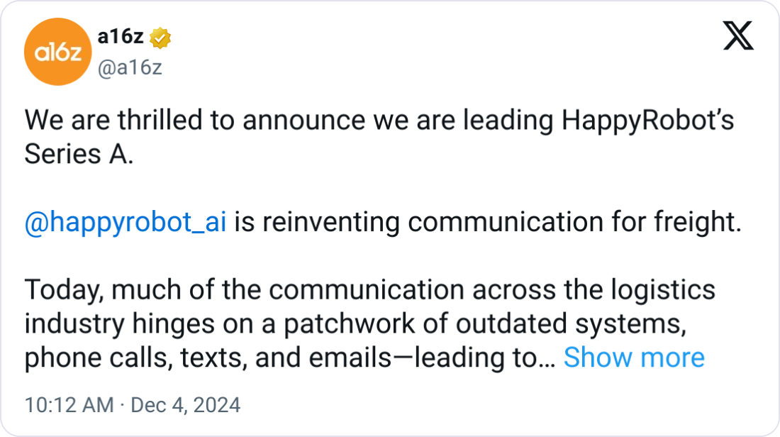 🤖 HappyRobot Secures $15.6 Million to Boost Its Agentic AI Tech. HappyRobot, a San Francisco-based innovator in AI-powered voice solutions for logistics, raised $15.6 million in Series A funding led by Andreessen Horowitz (a16z). Its AI agent platform automates logistics communications, reducing call times by 50% and cutting costs by 33%. Seema Amble, a16z partner, says the team was impressed by "how much customers love the product." Already handling over 100,000 AI-driven calls, it helps brokers optimize efficiency and focus on high-value tasks. The FreightCaviar Podcast snagged an exclusive interview with HappyRobot following their explosive F3 Rapid-Fire demo in Chattanooga – it'll drop across our channels on Monday.