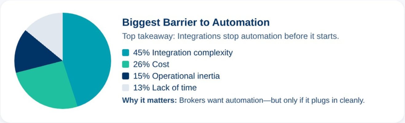 When we asked brokers why they’re hesitant to adopt automation, 45% said integration complexity, more than cost, lack of time, or operational inertia.