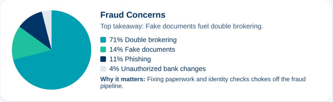 71% of brokers said double brokering is their #1 fraud concern, followed by fake documents at 14% – the sleeper issue that quietly drives disputed, delayed payments, and internal audit headaches.