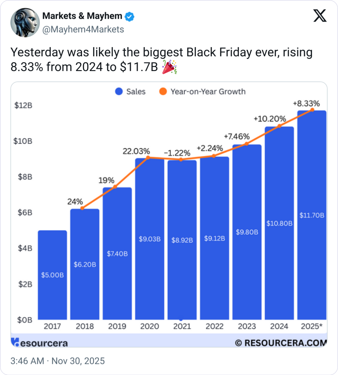🛍️ Black Friday Stays Big, Even as Shoppers Pull Back. Black Friday kicked off with heavy mall traffic and solid early momentum, even as retailers face a tougher economic backdrop shaped by tariffs, softening job growth, and fading consumer confidence. Shoppers leaned hard into discounts and shifted spending toward smaller-ticket buys. Mall traffic has surpassed 2019 levels, and retail groups expect holiday sales to grow roughly 3.6–4%. But budgets are tightening: consumers planned to spend about $890 on average, while tariffs have pushed retail prices up nearly 5%. Online channels continue to dominate as promotions stretch across weeks rather than a single shopping day.