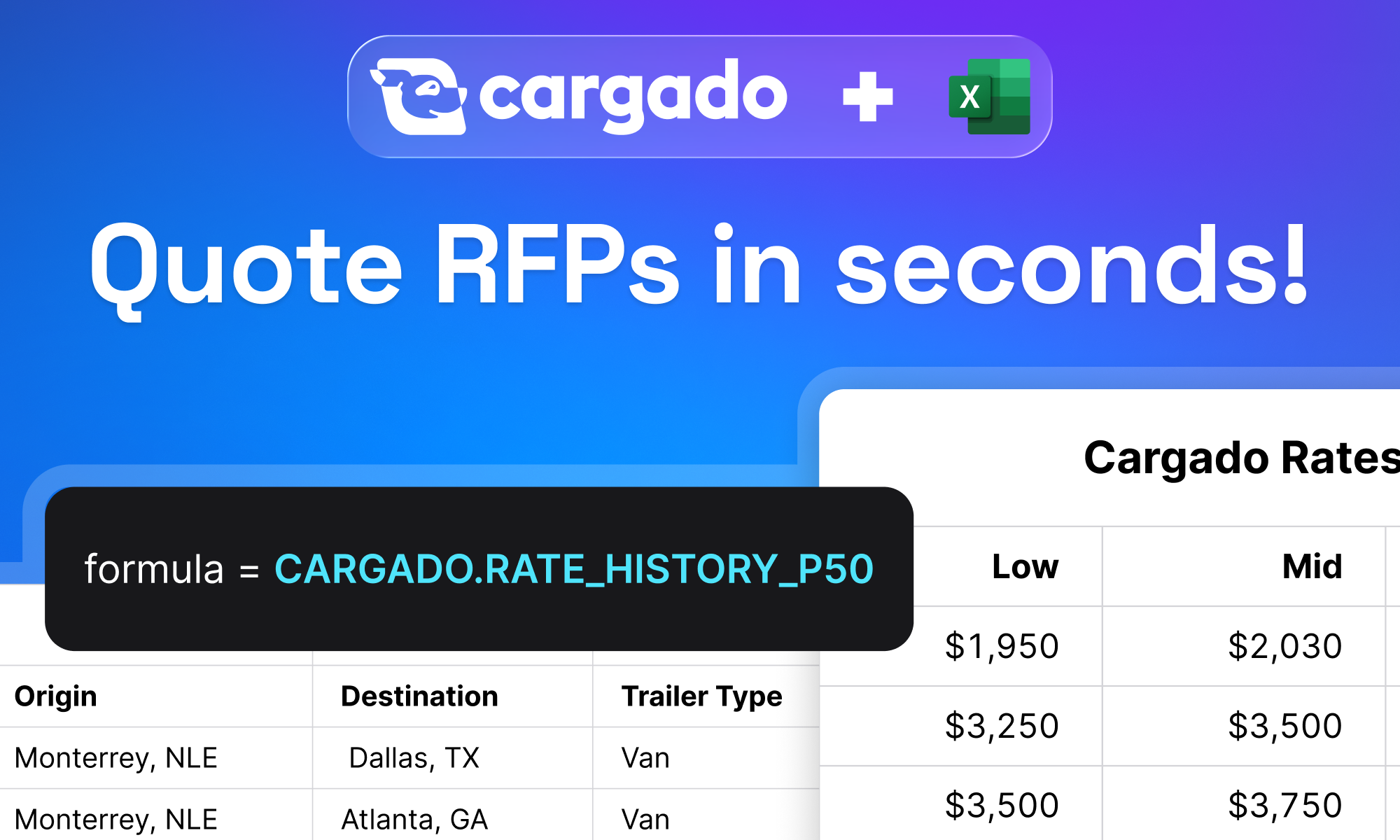 Cargado gives you everything you need to grow your Mexico and Canada business easily. Look up market rates instantly with Cargado Market Rates. Finish RFPs in seconds using the Cargado Add-In for Excel, and book trusted Mexico and Canada carriers fast!