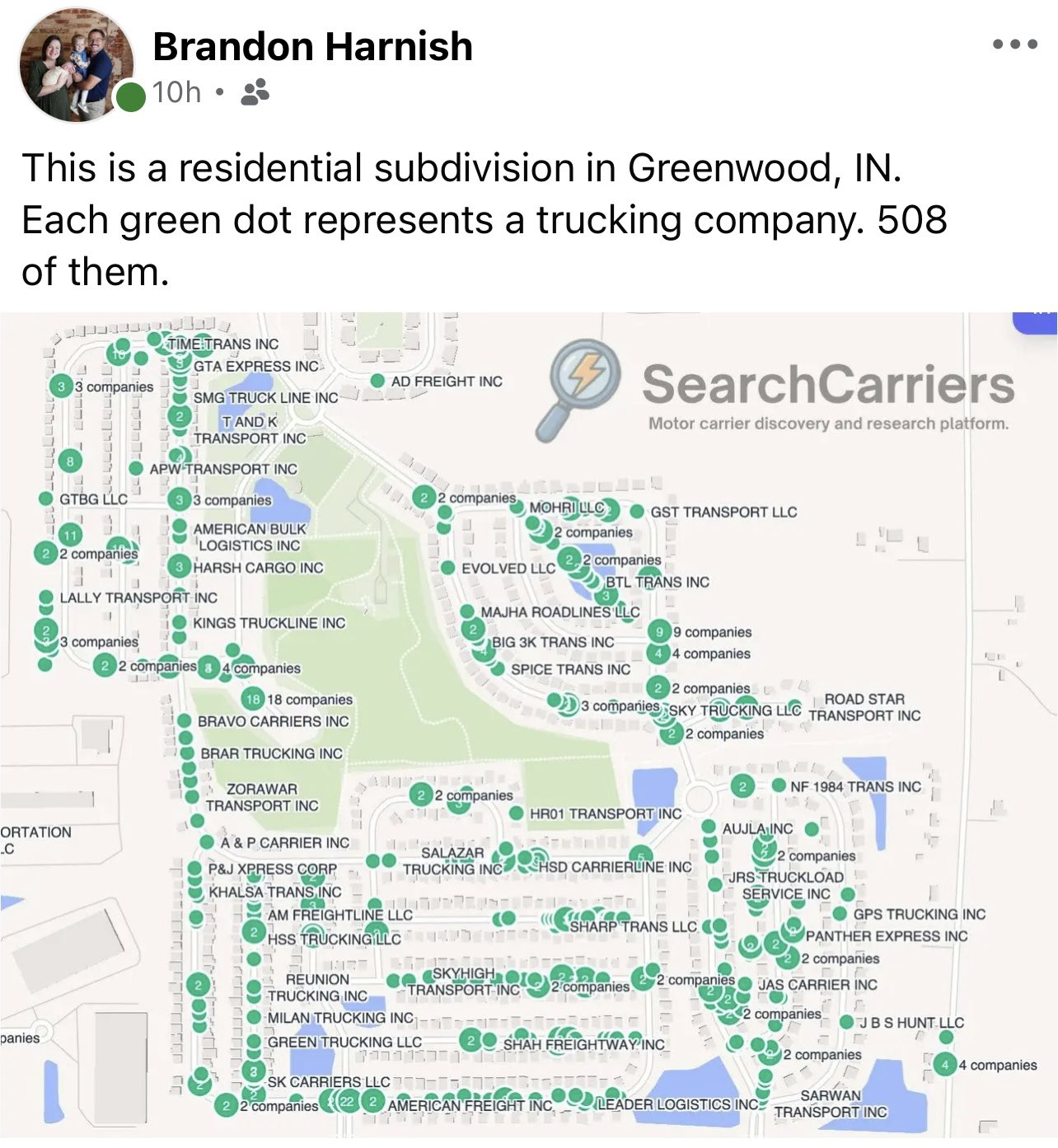 🏠 500+ carriers in one neighborhood. A Greenwood, Indiana neighboorhood is linked to hundreds of registered trucking companies, raising chameleon carrier concerns.