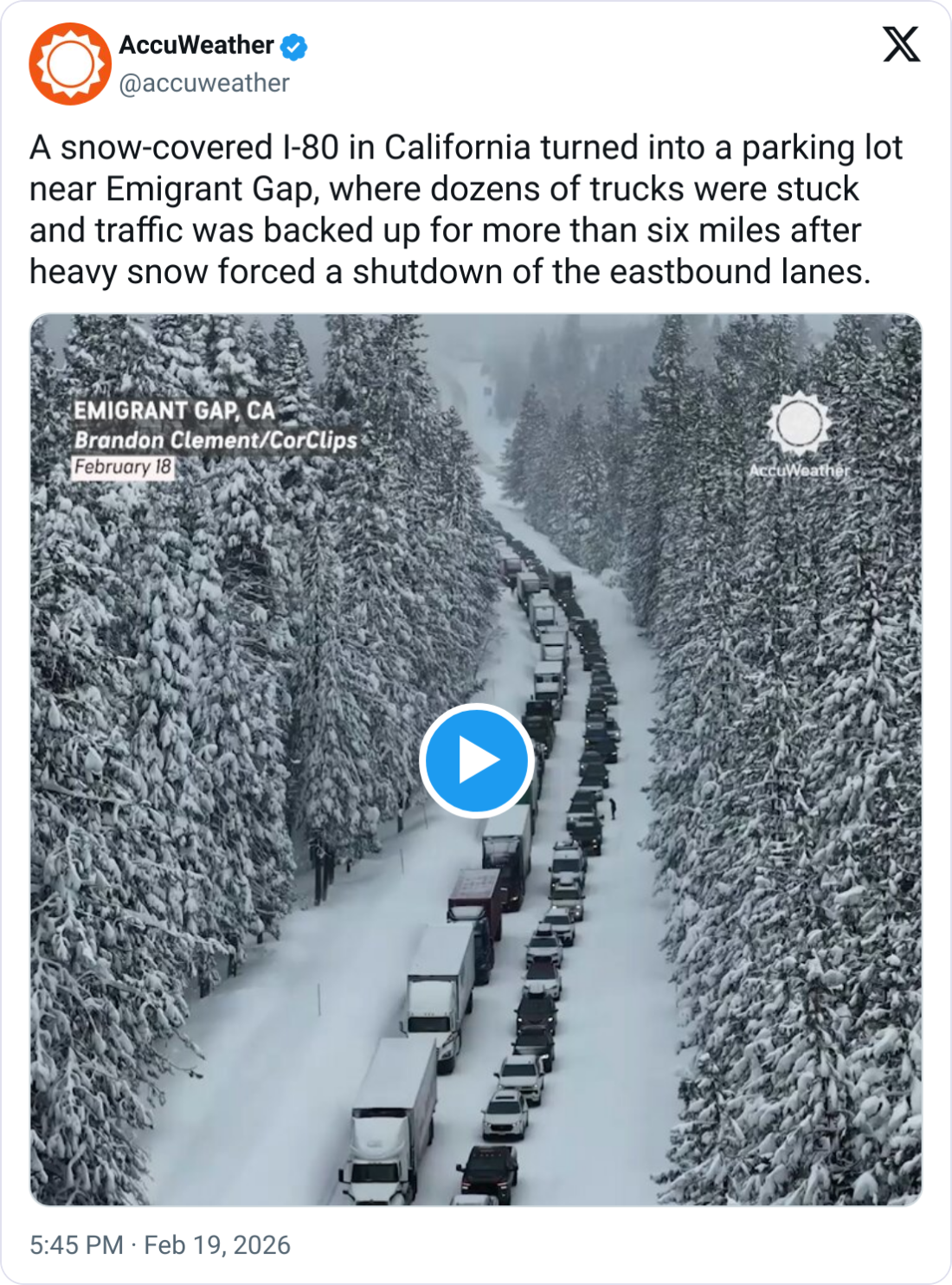 ❄️ Sierra Snow Shuts Down I-80 Freight Corridor. Heavy snowfall forced the closure of eastbound I-80 near Emigrant Gap, CA, stranding dozens of trucks and backing up traffic more than 6 miles. AccuWeather reported a snow-covered corridor that “turned into a parking lot” as chain controls and whiteout conditions halted movement. I-80 is a critical trans-Sierra freight route linking Northern California with Reno and the Mountain West, meaning delays can ripple into grocery, retail, and parcel networks.