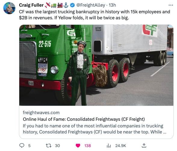 🚚 Yellow Corp. Sues Union for $137M Amid Financial Distress. Less-than-truckload carrier, Yellow Corp., is suing the International Brotherhood of Teamsters for $137 million for breach of contract. Yellow alleges that the union's interference has blocked proposed changes crucial for the company's survival and resulted in severe financial loss.