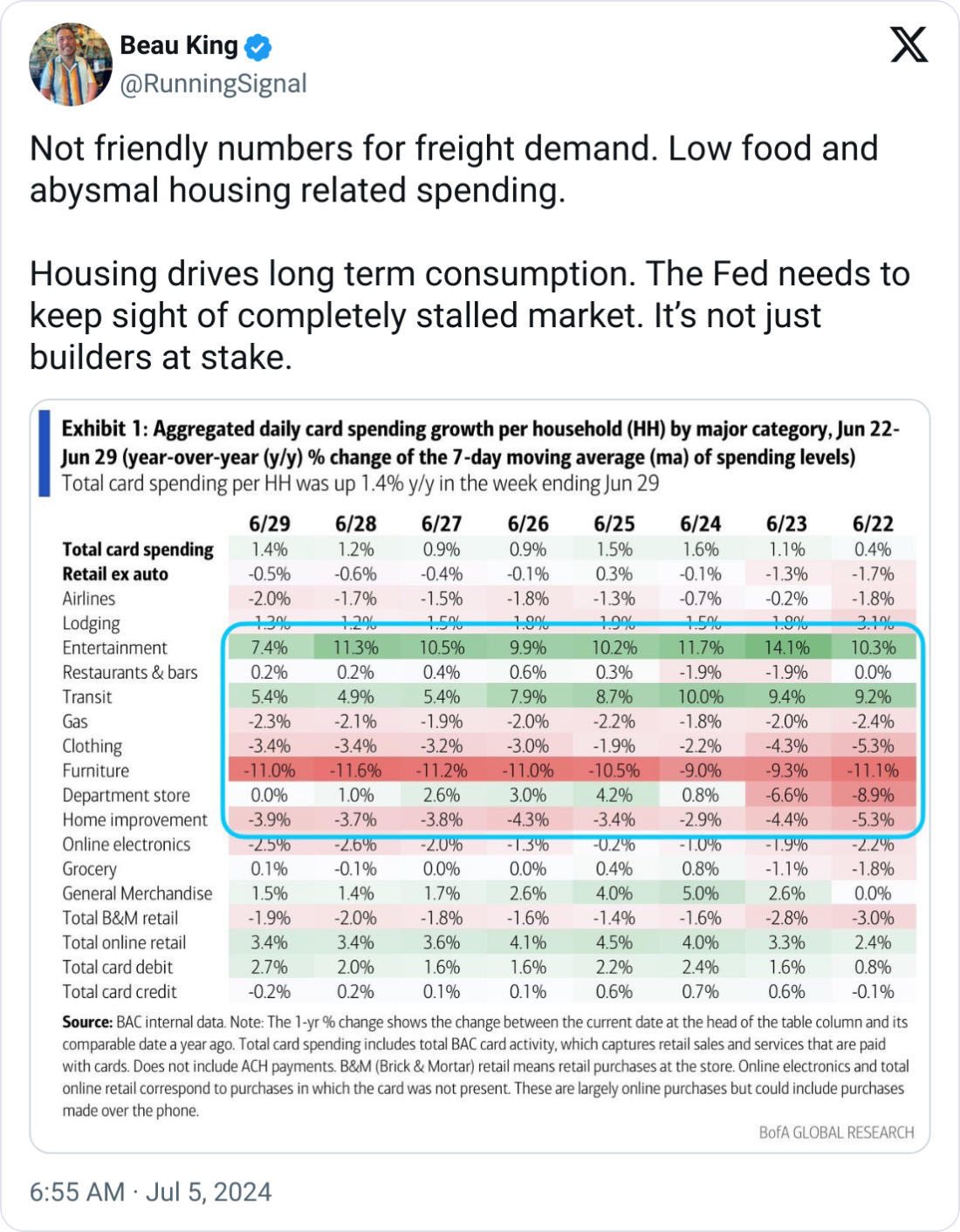 📉 BofA Highlights Shifts in Consumer Spending. Bank of America's latest Global Research report shows spending shifts in the last week of June. Furniture spending plunged around 11% year-over-year, with Clothing and Home Improvement both down approximately 3%. In contrast, Entertainment spending surged. Logistics expert Beau King commented on X, "Not friendly numbers for freight demand. Low food and abysmal housing-related spending. Housing drives long-term consumption. The Fed needs to keep sight of a completely stalled market. It’s not just builders at stake."