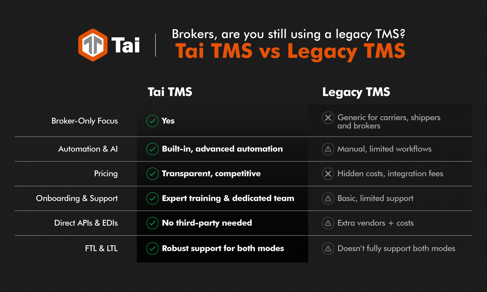 Today’s market demands speed, automation, and adaptability that legacy systems simply can’t deliver. Tai TMS delivers flexible workflows, integrations, and broker-focused tools that drive growth, even in a slow market.