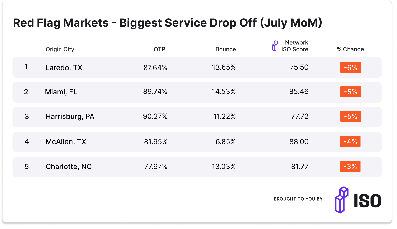 These key markets saw the biggest service drop-offs in July across the ISO* network.