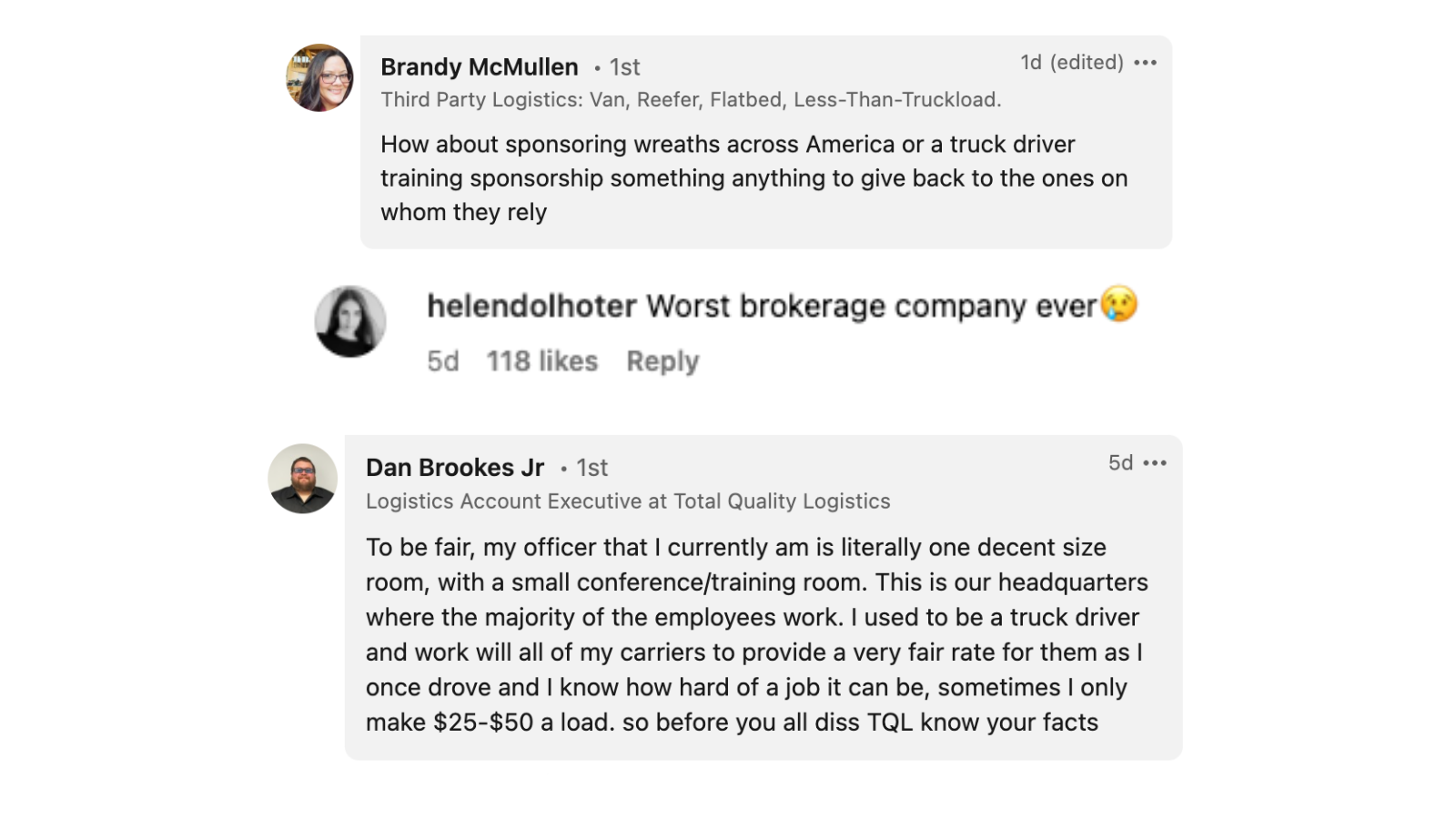 Whenever we post anything about TQL online, we receive a flood of comments—some positive, mostly from TQL employees, and the rest predominantly negative. Here are a few comments from our recent posts last week: