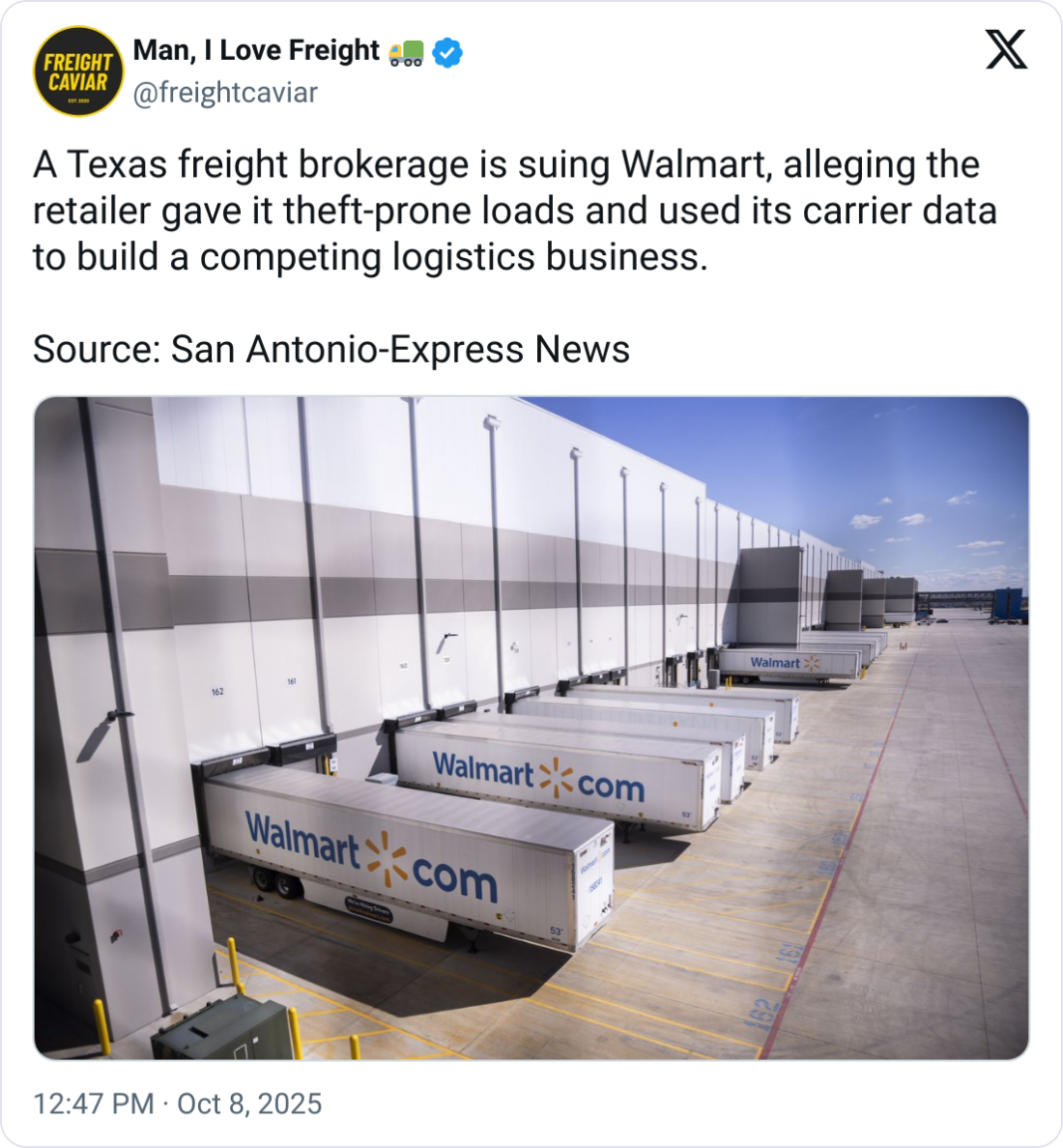 ⚖️ Texas Freight Broker Sues Walmart, Citing Unfair Competition. Texas based Barton Logistics has filed a $2 million lawsuit accusing Walmart of using its freight contracts to sabotage the company and pave the way for Walmart’s own brokerage business. The suit, filed Sept. 25 in San Antonio, alleges Walmart forced Barton to deliver loads it “knew would likely be stolen,” withheld payments, and used the disputes to extract carrier data. “It appears there’s a lot of pretext for bullying their way into the business my client has been in historically,” said Barton’s attorney Ryan Reed. Walmart denies wrongdoing, saying it “will respond appropriately to the Court.” Barton claims it laid off 70% of its staff amid the fallout.